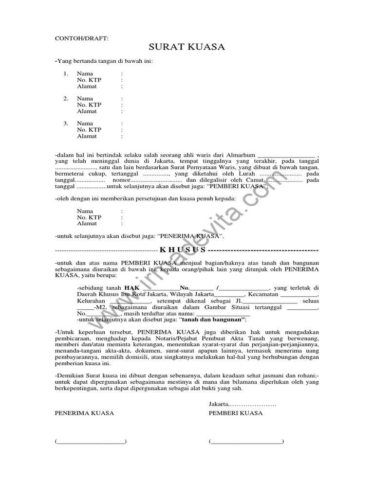 Jadi dalam pengurusan penjualan tanah atau rumah warisan tersebut, semua ahli waris tidak perlu hadir dan hanya diwakilkan oleh satu ahli waris yang telah diberi kuasa tersebut. File draf surat kuasa ahli waris ini berisi pemberian kuasa dari para ahli waris untuk melakukan penjualan harta warisan, pembagian harta warisan diantara para ahli waris serta untuk mengambil gaji terakhir dan tunjangan pewaris lainnya sebagai karyawan perusahaan. Surat kuasa pengisian formulir honorer. Contoh surat kuasa bayar pajak motor. Contoh surat wasiat untuk ahli waris.